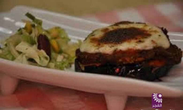 – ترص طبقه من الباذنجان في صينيه بايركس وتغطى بطبقه من جبنة المزرولا المقطعة شرائح