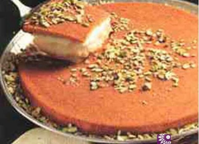 ثم توضع الطبقة الأولى في وعاء و توضع فوقها القشطة ثم توضع الطبقة الثانية و تزين بالفستق
