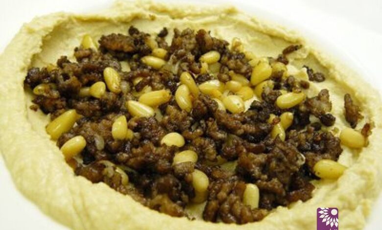 ٦. توضع اللحمة المقلية في وسط طبق الحمص، ويرش الصنوبر المقلي على وجه الطبق للتزيين. يقدم الطبق مع الخبز العربي.