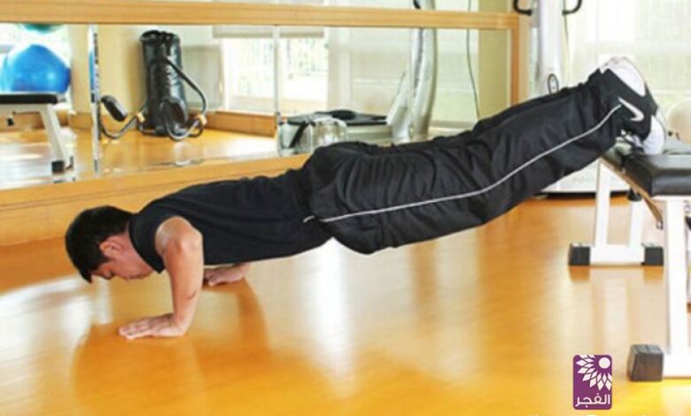 3) اعثر على كرسي مرتفع ثم استخدمه في وضع قدميك عليه مع بقاء جسمك في وضع أفقي للأسفل، ابدأ بتنفيذ تمارين الضغط مع ضرورة الصعود لأعلى في خط مستقيم مع قدميك، والهبوط مرة أخرى لأسفل بزاوية ميل تقدر بـ90 درجة.