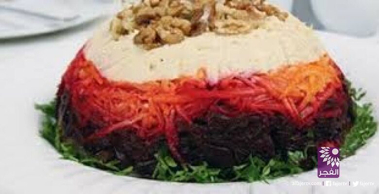 يبطن وعاء زجاجي بورقة نايلون. يسكب خليط الدجاج في الوعاء ويسوّى سطحه. تسكب من ثم طبقة من الجزر وبعدها طبقة من الشمندر وبعدها طبقة من شرائح الأفوكادو. يغطى الوعاء ويحفظ في الثلاجة 3 إلى 4 ساعات. يقلب محتوى الوعاء فوق طبق التقديم ويزين أعلاه بالجوز بالمطحون خشناً.