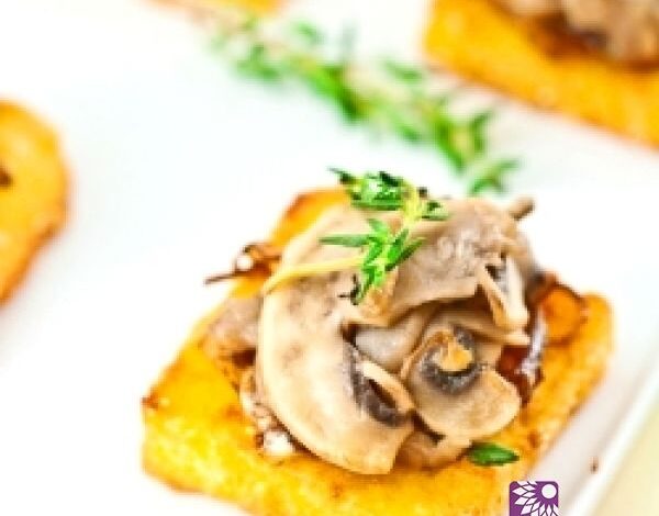 3-  عند التقديم تحمر مربعات البولينتا فى قليل من الزبدة من الجانبين حتى تحمر وتسخن ثم نضع فوق كل مربع قليل من الباربكيو صوص ثم قليل من المشروم ويزين بالزعتر ويقدم.