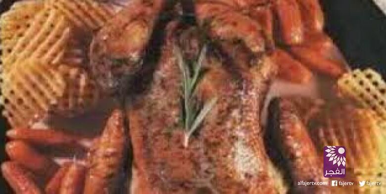 اخرجي الدجاج من الفرن وانزعي عنه الكيس ثم ضعيه في طبق التقديم مع البطاطس المقليه والخضار المسلوقه