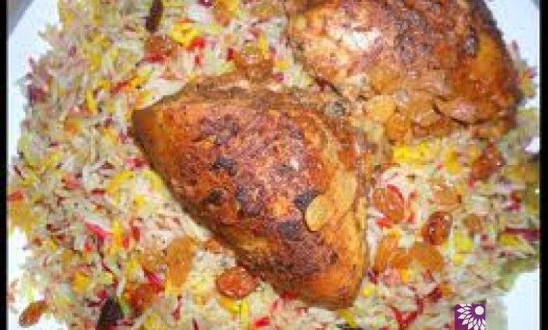 – نوزع خليط ماء الورد والزعفران، وخليط الشبنت على جانب سطح الأرز، مع ترك جزء من الأرز أبيض بدون لون