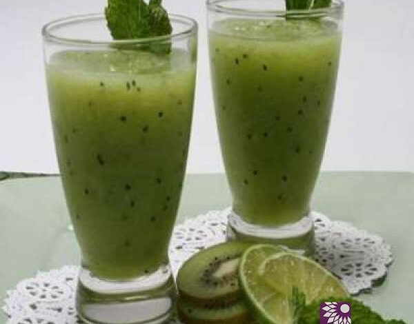 نقشر حبات الكيوي ونضعه في الخلاط مع النعناع وعصير ليمونه والسكر ونضربه بالخلاط