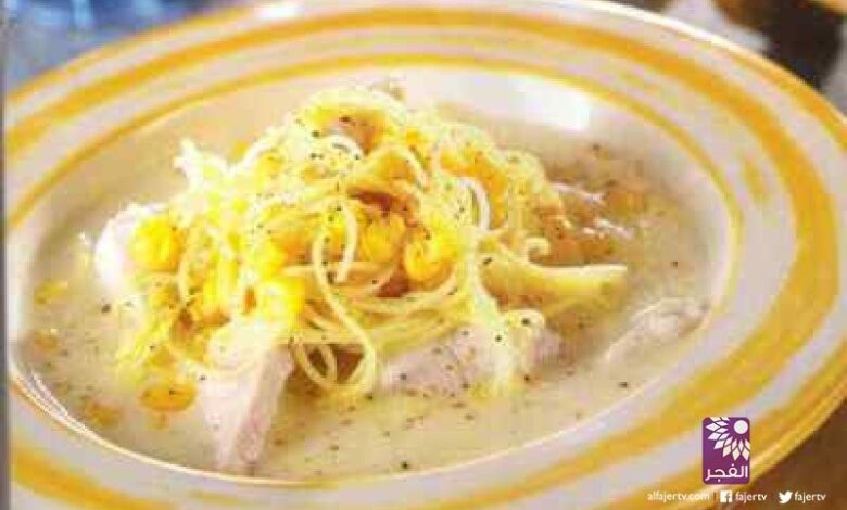 يسلق الدجاج نصف سلق ثم يقطع الى شرائح متوسطة فى السمك< توضع صدور الدجاج فى وعاء عميق ويصب فوقها الكريمة ومرقة الدجاج ويترك ليغلى على النار ثم تخفض الحرارة ويترك المقدار على النار لمدة 10 دقيقة< فى تلك الاثناء تسلق المكرونة ثم تصفى وتشطف.< يعاد تتبيل الشوربة ثم يمزج النشا مع اللبن فى كوب ويصب فوق الشوربة وتقلب.< تضاف المكرونة والذرة الحلوة الى الشوربة ثم تصب فى اطباق التقديم وتقدم ساخنة.