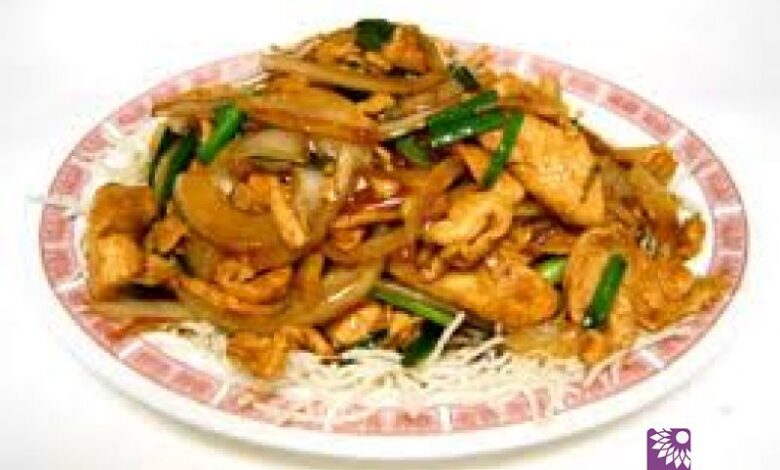 – يسخن الزيت في مقلاة كبيرة ثم يضاف الثوم و البصل و الفلفل الملون والدجاج و الزنجبيل ويقلب لمدة 5 دقائق على النار.