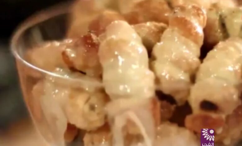– انزعي النوى من حبات التمر وخذي شريطاً من العجينة ولفيه على حبة التمر لتغطيها تماماً مع ترك جزءٍ صغير جداً من أطراف حبة التمر خارج العجينة، ثم ضعيها في الصينية.