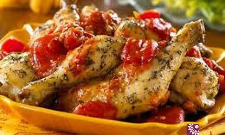 4- عند التقديم ترص أفخاذ الدجاج فى طبق التقديم ثم نضع فوقها صوص الطماطم السابق تجهيزه وتقدم.