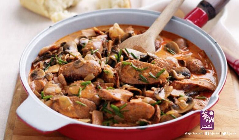 أضيفي معجون الطماطم، والبابريكا وحساء اللحم مع التقليب لمدة 5 دقائق ثم أضيفي السوسيس، كريمة الطبخ واتركيها لمدة 10 دقائق.