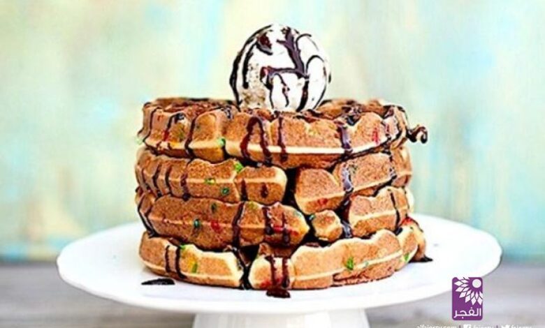 3. تقدم شرائح الوافل على شكل كعكة كبيرة وتزين بشراب الشوكولاته والرقائق الملونة.