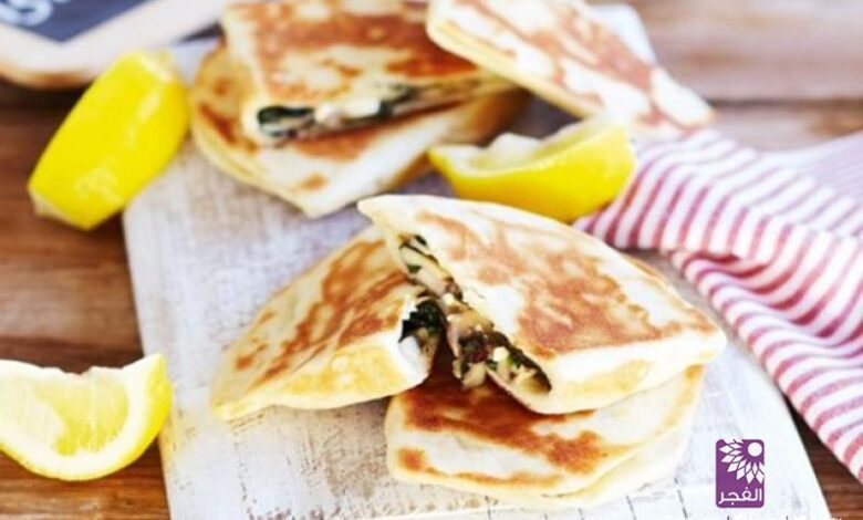 4. تقسم العجينة الى 8 اجزاء. ترق كل قطعة عل شكل مستطيل 10*15 سم. تخلط الفتا مع السبانخ وتوضع على جزء من المستطيل.توضع الجبنة فوقه. تلف العجينة وتغلق جيدا. تكرر العملية لباقي العجينة، حتى تنتهي كمية السبانخ والجبن.