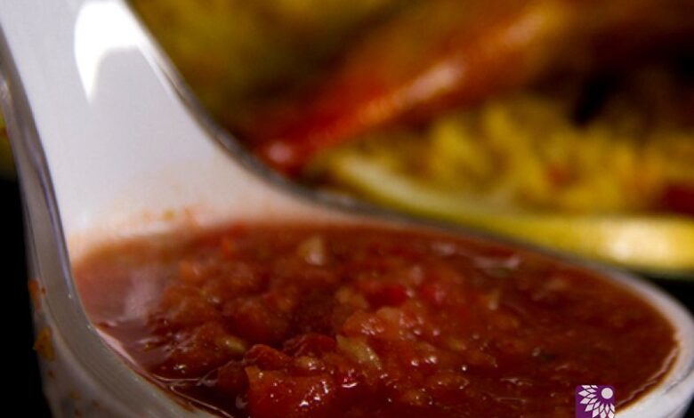 1-يفرم البصل مع الفلفل والتوابل ثم نبشر الطماطم باليد ويخلط المزيج جيدا ويتبل بعصير الليمون والخل والصلصة الحارة ويحفظ في الثلاجة حتي التقديم.
