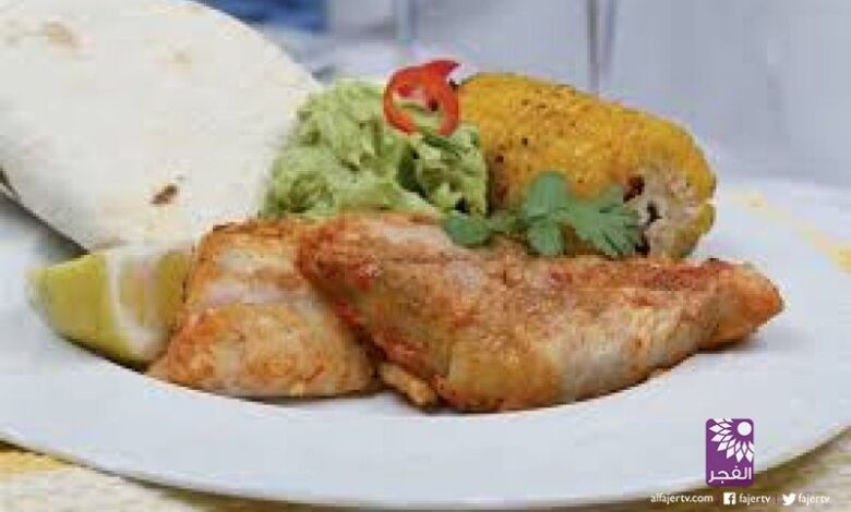 – يوزع السمك والذرة وكريما الأفوكادو والتورتيلا على أطباق التقديم. يقدم الطبق مع شرائح الليمون.